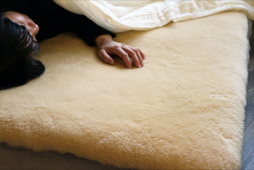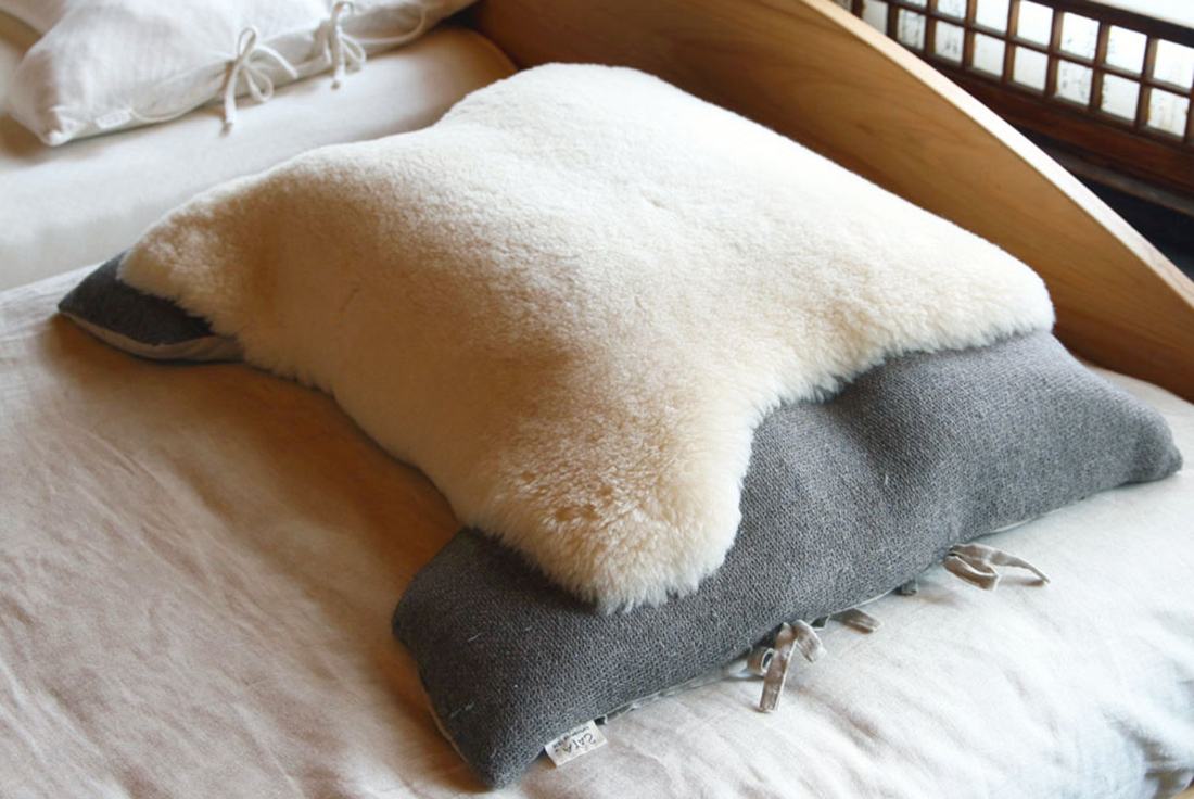 羊の毛皮ムートンを枕用のパッドに仕立てました。裏面のゴムベルトで枕に固定します。