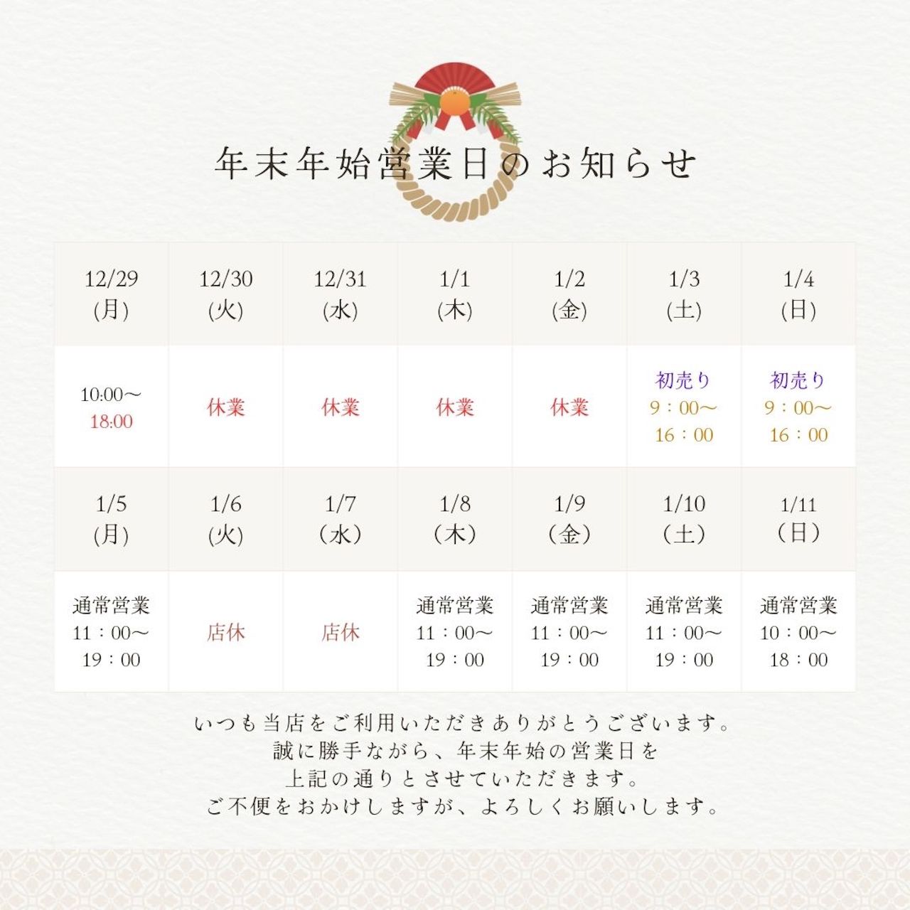 ・初売り期間中(1月3~4日)は営業時間が異なります。