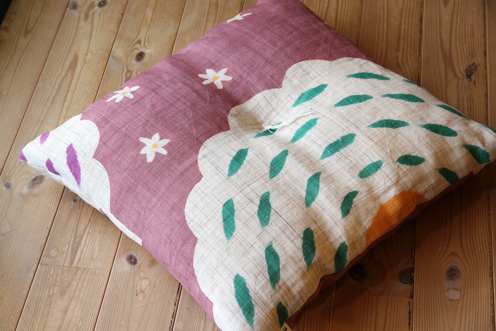 染色作家 宮崎登志雄さんが1点1点手描き・手染めした本麻生地で仕立てた座布団です。