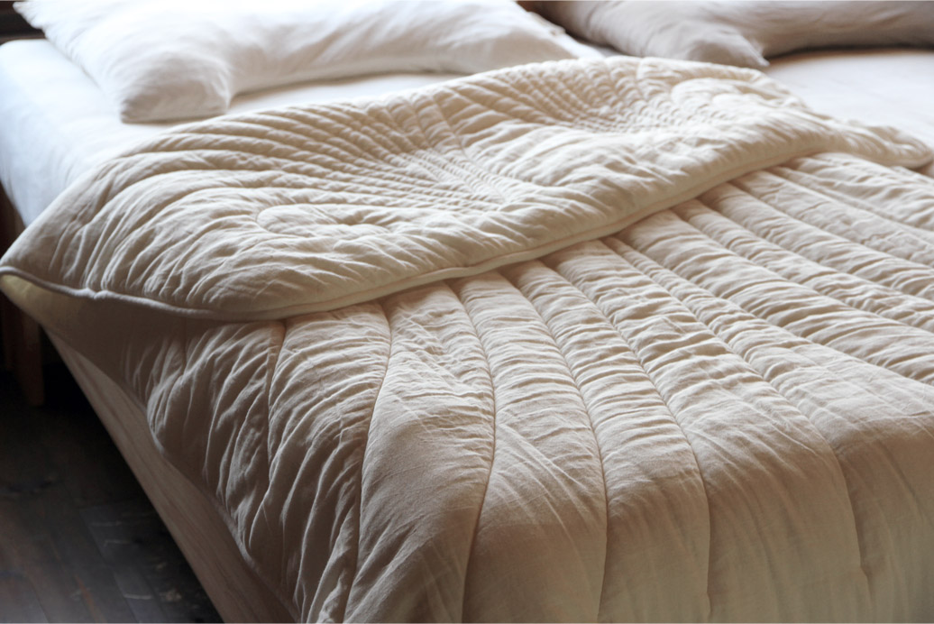 良質なブリティッシュウールをガーゼの生地で包み込んだ優しい風合いの掛ふとんです。